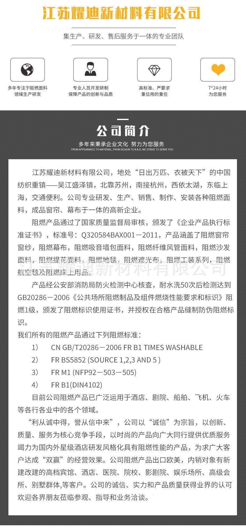 江苏耀迪新材料有限公司位于"日出万匹、衣被天下"的中国纺织重镇苏州市吴江区盛泽镇。同中国纺织业学府东华大学材料科学与工程学院,纤维材料改性国家重点实验室共建产学研基地,并与合肥工大化学与化工学院建立以我公司为主导的纳米粉体工程技术研发中心,组成耀迪博士后工作站为公司技术基石。